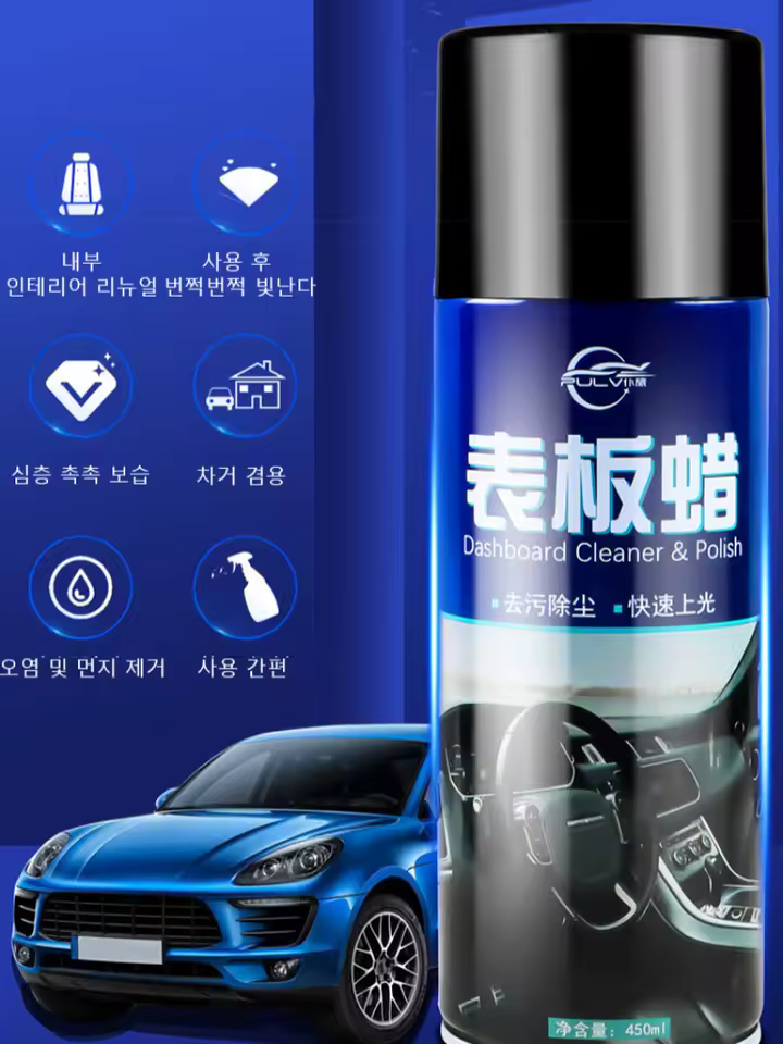 대시보드 클리너 리프레시 미스트(450ml, ₩3,898)는 차량 내부, 가죽 시트, 천장 얼룩 제거에 효과적입니다.